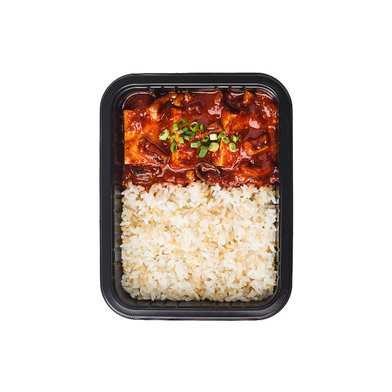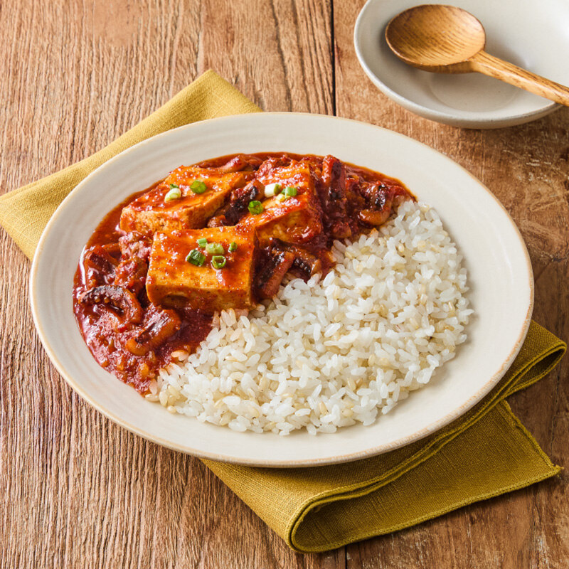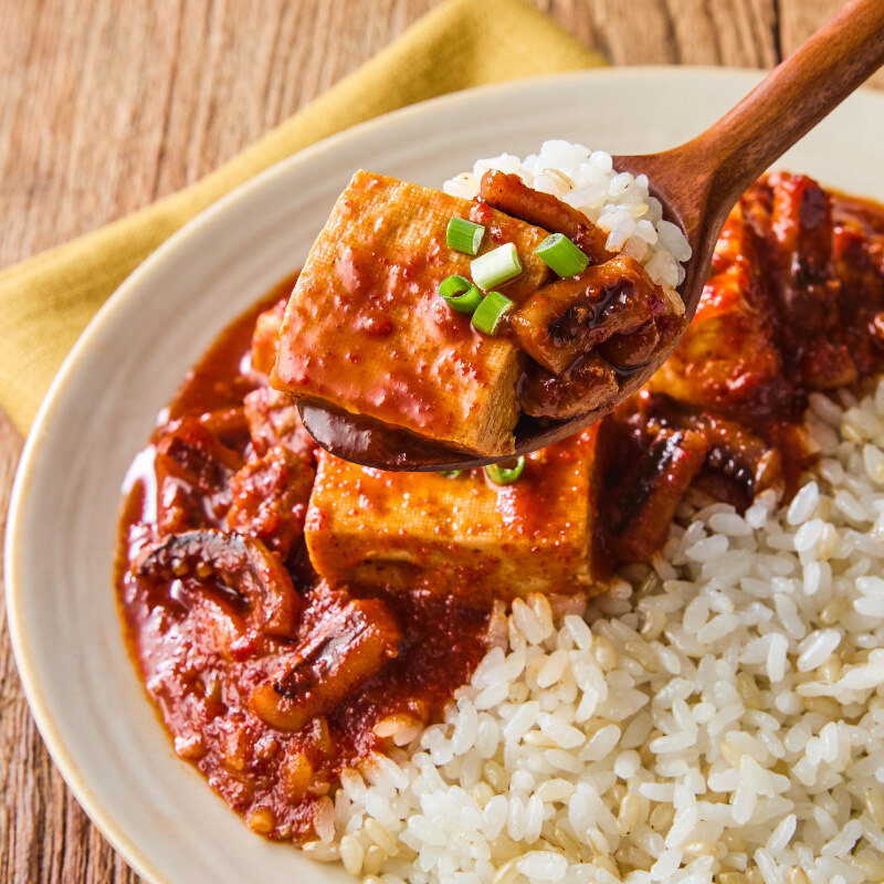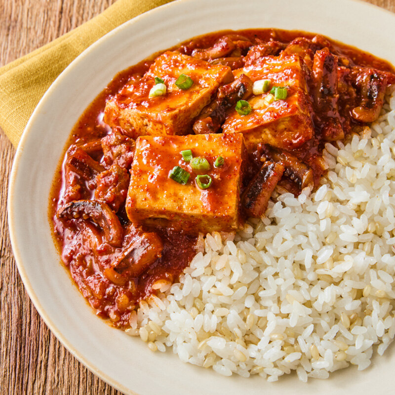 대전의 대표적인 별미, 칼칼한 두부 두루치기를 구수한 현미 쌀밥 위에 가득 올렸어요. 직접 만든 보리고추장 베이스에 국산 청양고추를 더해, 자극적이지 않으면서도 입에 착 붙는 깔끔한 매운맛을 완성했죠. 두부만 먹어도 밍밍하지 않도록 정성껏 졸여내 소스가 두부 속까지 쏙 배어들었어요.