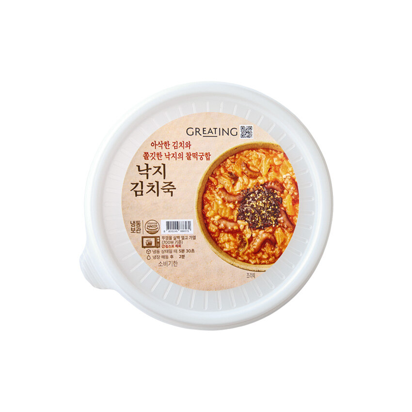 유난히 몸이 무겁고 기력이 부족한 날, 마음까지 든든한 온기를 전해줄 그리팅 낙지김치죽을 추천해요. 쫄깃한 낙지에 새콤한 국산 김치를 쫑쫑 다져 넣었어요.