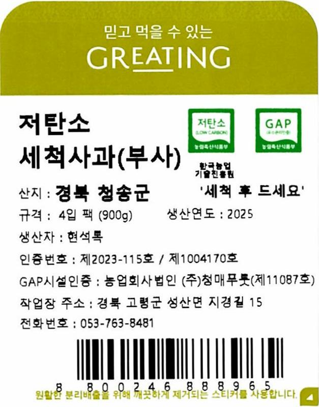 환경친화적 저탄소 농법으로 재배한 청송 세척사과로