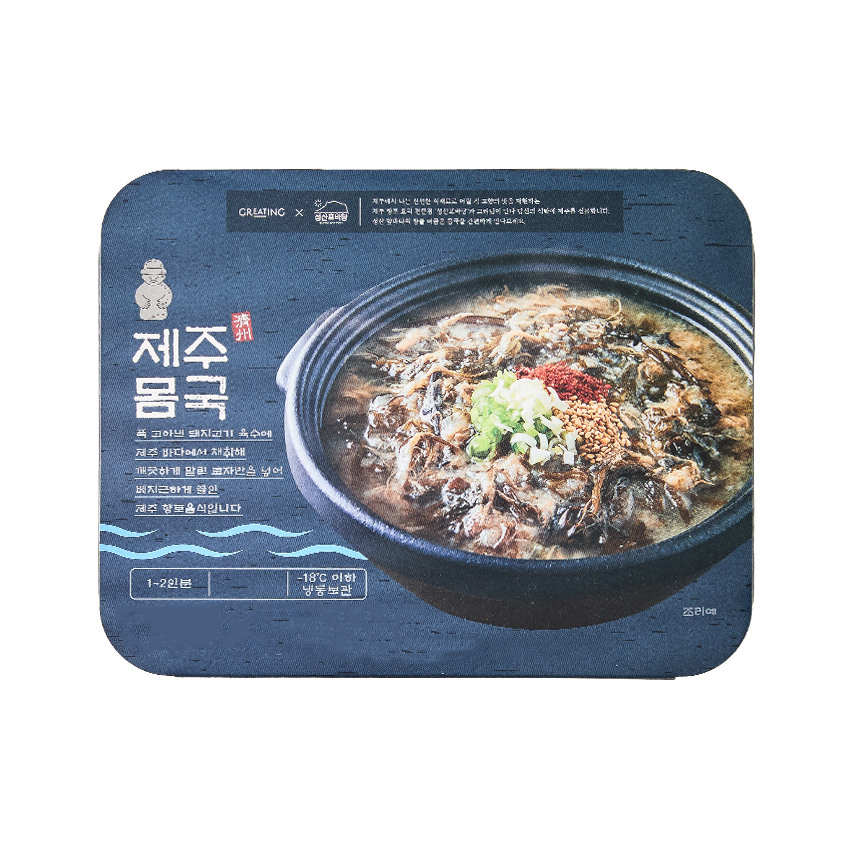 제주에서 나는 신선한 식재료로 어릴 적 고향의 맛을 재현하는 제주 향토 요리 전문점 '성산포바당'과 그리팅이 만나 당신의 식탁에 제주를 선물합니다. 푹 고아낸 돼지고기 육수에 제주 바다에서 채취해 깨끗하게 말린 모자반을 넣어 배지근하게 끓인 제주 향토음식, 몸국입니다. 성산 앞바다의 향을 머금은 몸국을 집에서도 간편하게 만나보세요.