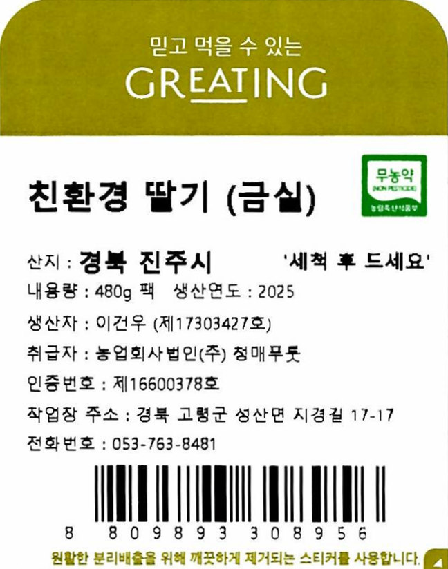 [그리팅] 친환경 금실딸기 480g