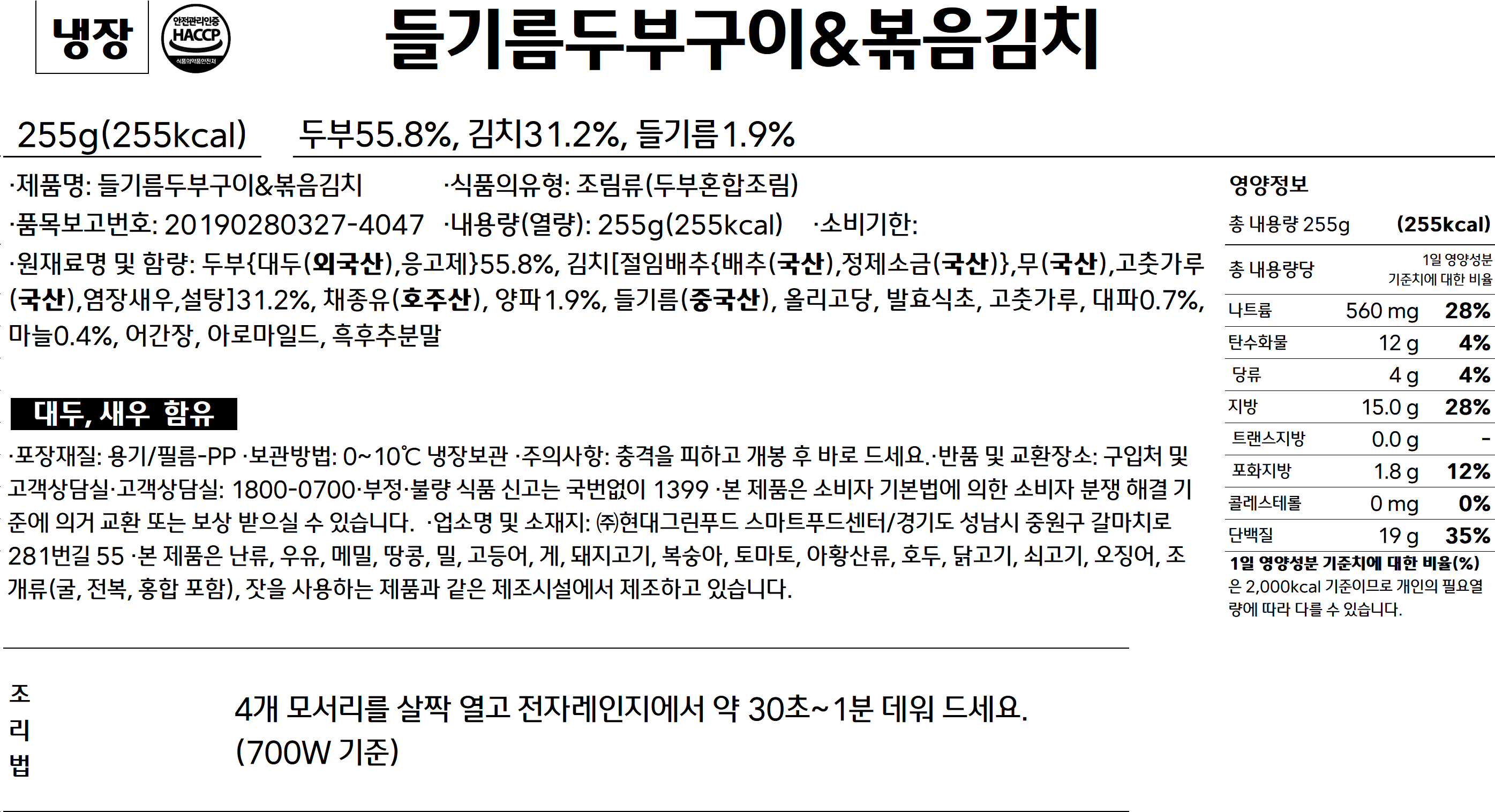 밥반찬으로도, 우리 아빠의 술안주로도 좋은 들기름 두부구이&볶음김치를 소개해요. 담백한 두부는 들기름을 발라 노릇하게 구워냈고, 볶음김치는 국산 배추와 고춧가루를 사용해 좋은 식재료의 맛을 살렸어요. 번거로운 재료 손질 없이 전자레인지 조리로 간편하게 밥반찬을 준비해 보세요.