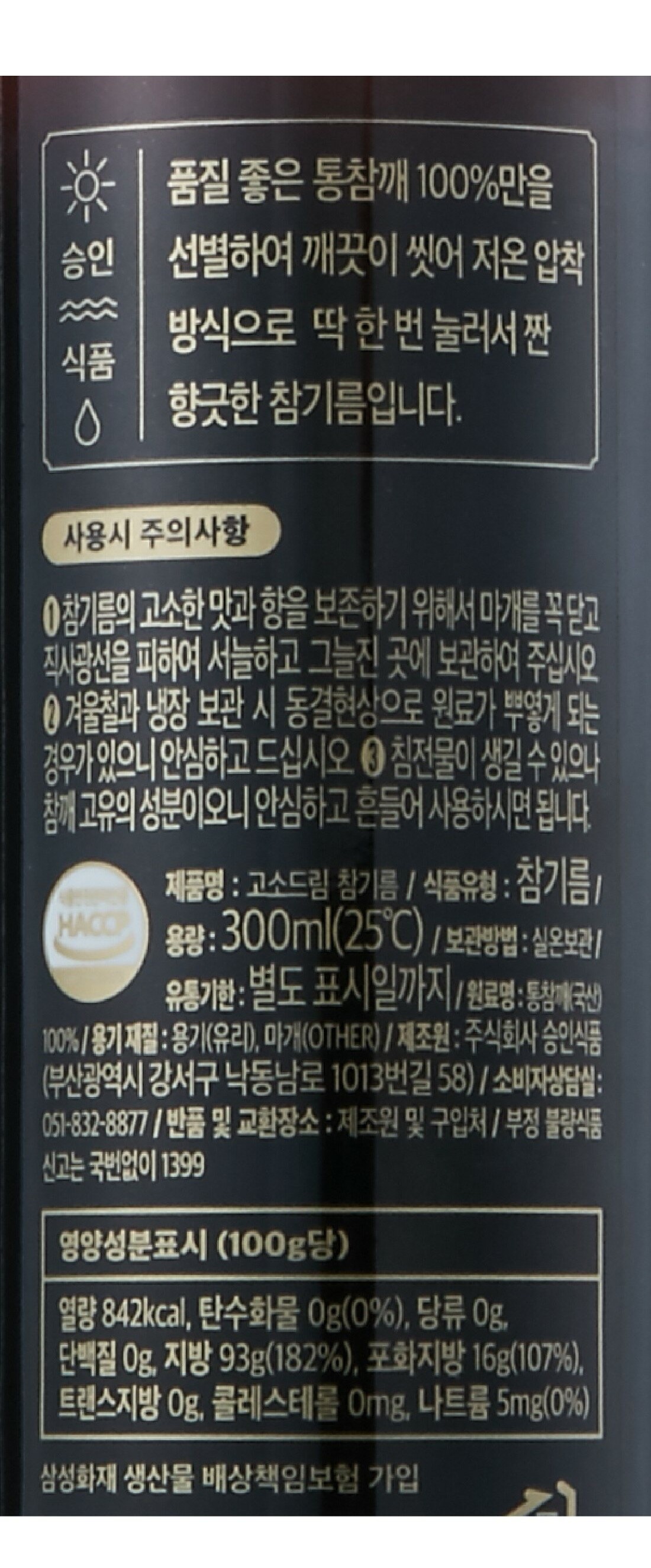 *최순희 명장이 만든 국산 참기름 300ml 유통기한 : 2022-03-04