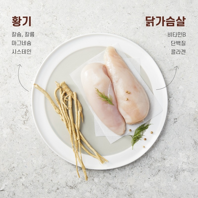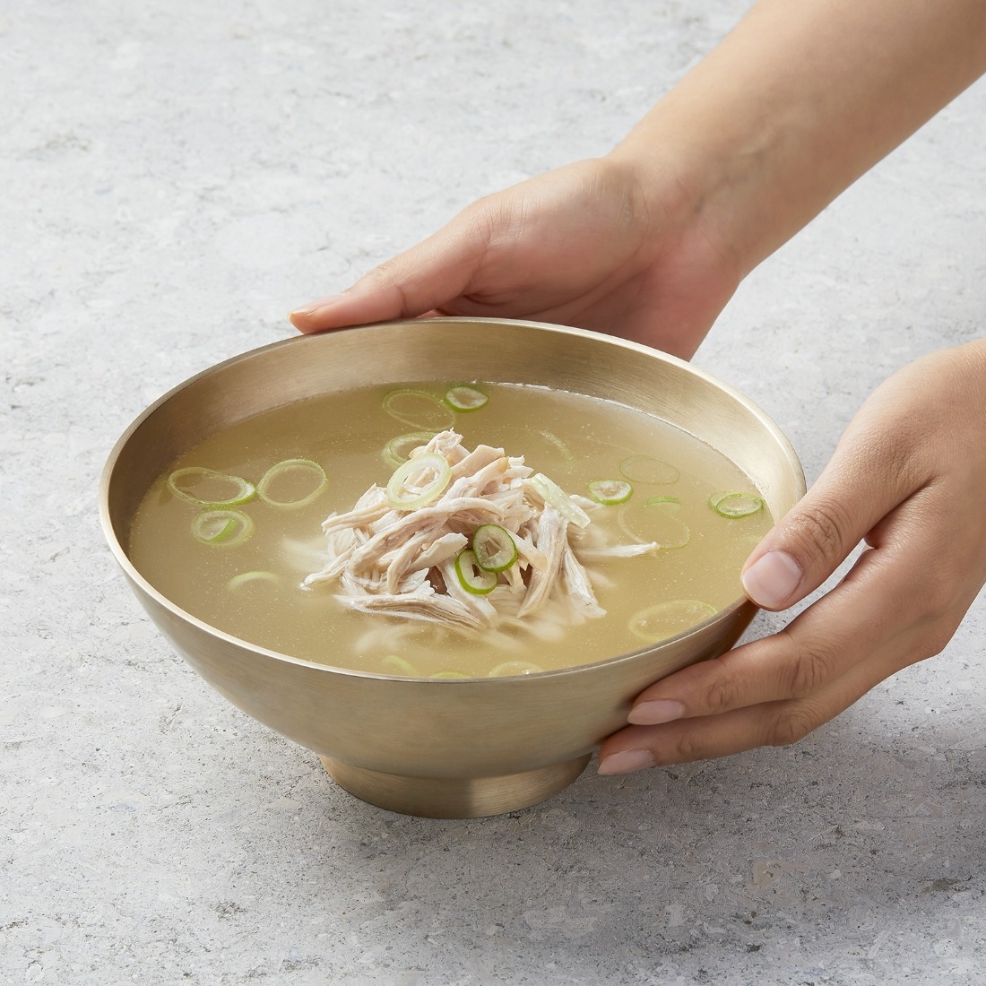 닭 뼈를 푹 고아낸 육수에 황기를 통째로 넣어 영양은 물론, 깊고 진한 풍미까지 가득 담았어요. 국산 닭가슴살을 잘 손질해 데친 후, 결대로 찢어 올렸어요. 기름기 없이 담백해 기력이 떨어지는 날, 건강식으로 좋아요.