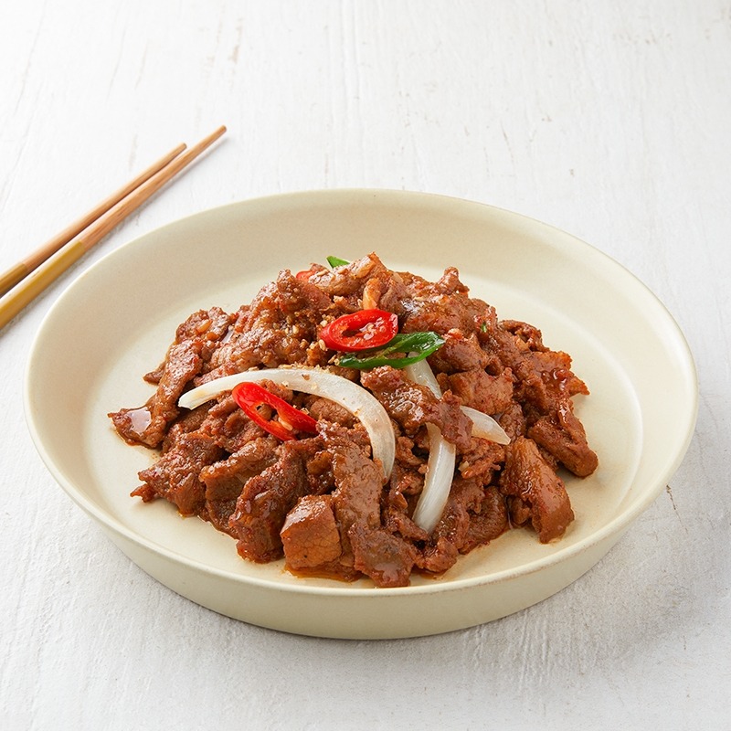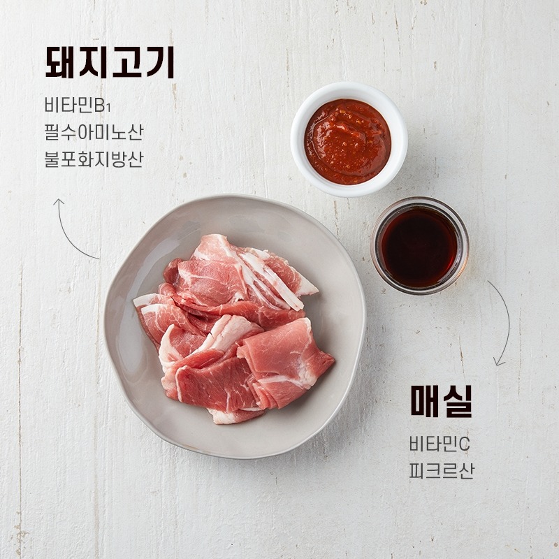 고추장 대신 매실과 고춧가루로 맛을 내어 깔끔하게 매콤한 돼지불고기입니다. 국산 무항생제 돼지고기를 매실 진액에 재워 잡내를 잡고, 은은한 단맛을 더했어요. 순한 국산 고춧가루와 국산콩 간장, 5년 숙성 어간장을 배합해 만든 특제 양념으로 익숙하면서도 건강한 매콤 불고기의 맛을 완성했답니다.