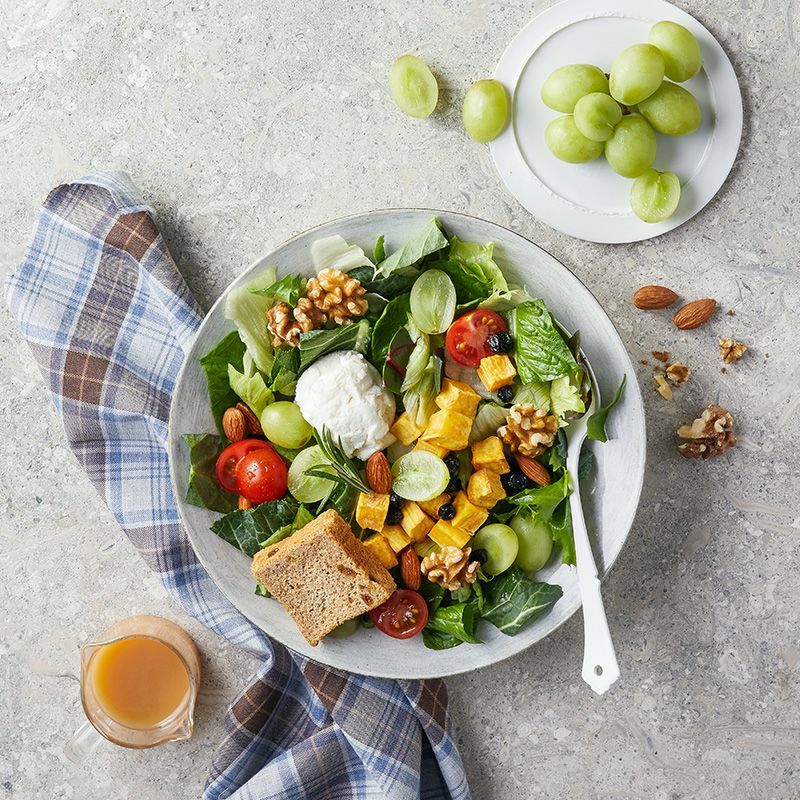 리코타 치즈의 '리코타'는 이탈리아어로 '두 번 데웠다'라는 뜻인데요. 단백질이 풍부하고 영양도 높아 많은 사람들에게 사랑받는 리코타를 더한 샐러드를 선보여요. 오독오독한 식감의 호두, 아몬드, 건블루베리와 상큼한 청포도, 구운 호박 고구마를 토핑으로 넣어 다채롭게 구성했어요. 그리팅은 설탕 대신 100% 바나나 퓨레와 알룰로스로 단맛을 내어 건강한 드레싱을 만들었는데요, 신선한 잎채소에 다양한 토핑과 건강한 스위트 바나나 드레싱을 곁들여 드셔보세요.