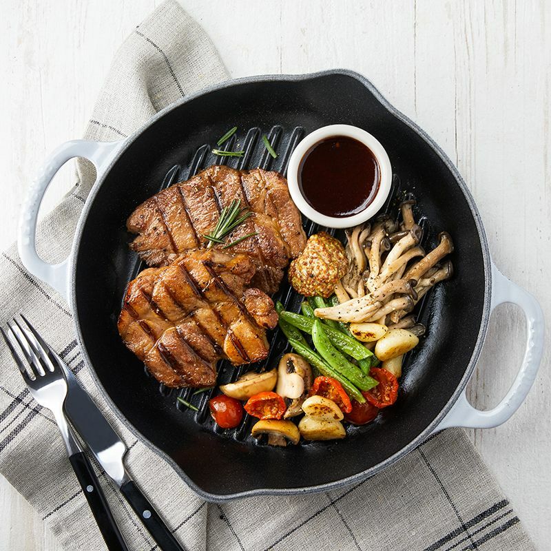 스테이크의 핵심인 고기는 스페인산 돼지고기의 두툼한 목살로 엄선했어요. 로즈마리와 스페인산 엑스트라버진 올리브유로 마리네이드해 별도 숙성이 필요 없죠. 그린빈스, 토마토, 양송이버섯 등 채소 가니쉬는 오븐에 노릇하게 구웠어요. 레드 와인과 프랑스산 고메 버터를 뭉근히 졸여 만든 특제 소스는 스테이크에 한층 풍부한 맛을 더해줄 거예요. 맛있게 구울 자신이 없더라도 걱정 마세요. 함께 동봉된 레시피 카드로 조리 방법까지 친절하게 알려드리니, 단 15분이면 누구나 근사한 스테이크를 만들 수 있답니다!