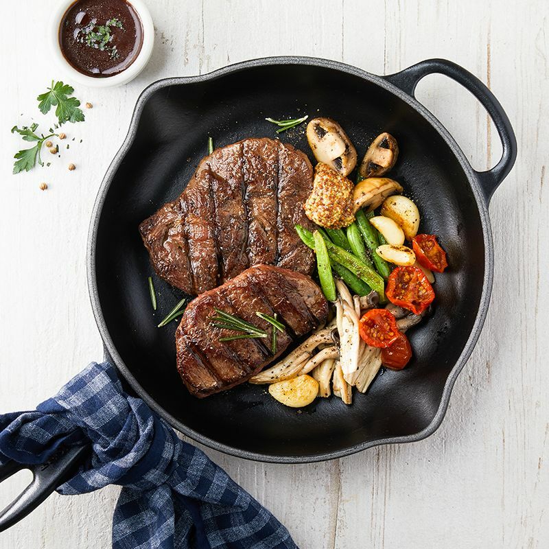 근사한 연말 홈파티에 제격인 그리팅 로맨틱 패키지를 소개해요. 스테이크의 핵심인 고기는 미국산 초이스등급 소고기 부채살로 엄선했고, 로즈마리와 올리브유로 마리네이드 했어요. 그린빈스, 양송이버섯 등 채소 가니쉬는 오븐에 노릇하게 구웠어요. 레드 와인과 버터를 뭉근히 졸여 만든 특제 소스는 스테이크에 한층 풍부한 맛을 더해줄 거예요.
