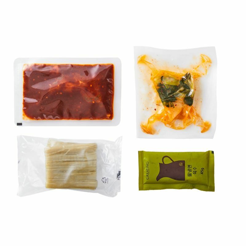 가늘고 찰진 특제 면발에 매실액을 넣어 매콤새콤하게 만든 비법 소스가 어우러져 감칠맛이 풍부한 비빔냉면이예요. 시원하고 아삭한 식감을 더해줄 얼갈이, 무절임 고명이 함께 제공돼요. 이제 집에서도 간편하게 장인의 손맛, 한솔냉면을 즐겨보세요.