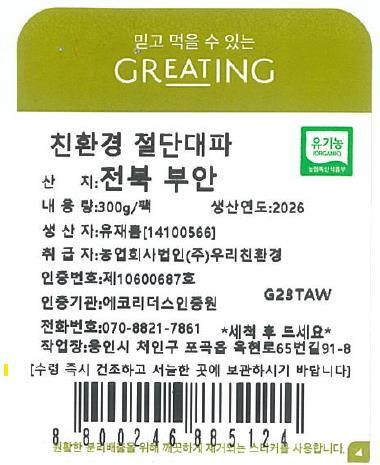 [그리팅] 친환경 대파(절단) 300g