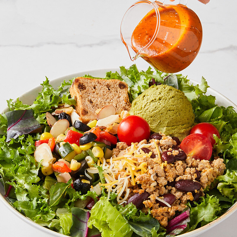 그리팅이 자신있게 선보이는 멕시칸풍 타코 샐러드를 만나보세요. 돼지고기와 강낭콩을 구기자 간장소스와 카레 분말, 토마토 페이스트 등으로 만든 양념에 버무린 토핑으로 색다른 풍미를 더했어요.