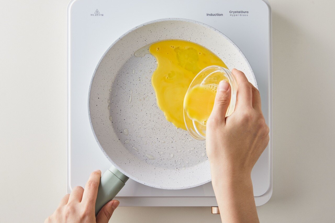 팬에 계란 물을 부어 펼친 뒤, 살짝만 익혀주세요.