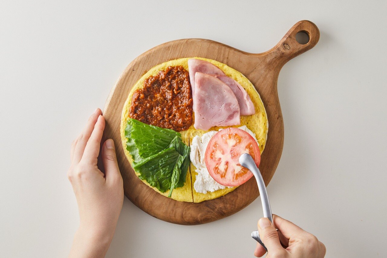 리코타 치즈, 토마토 소스, 청상추, 햄, 토마토를 또띠아 위로 올려 주세요.