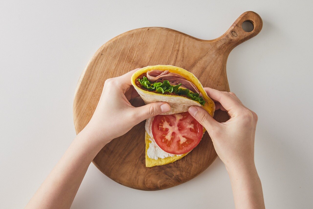 절단면을 기준으로 총 3번 접어주면 든든한 폴딩 또띠아 샌드위치 완성이에요!