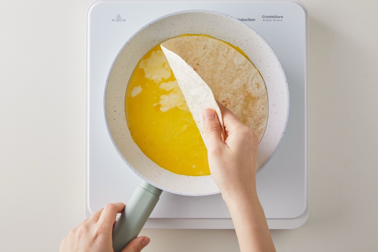 윗면이 덜 익은 계란 위로 또띠아를 덮은 뒤, 1분가량 더 익혀주세요.