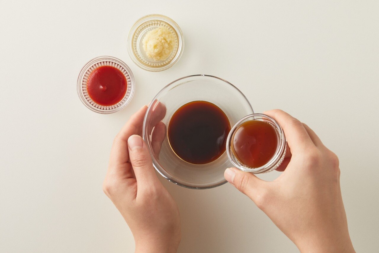 굴 소스, 케첩, 데리야키 소스, 다진 마늘을 섞어 양념장을 만들어주세요.