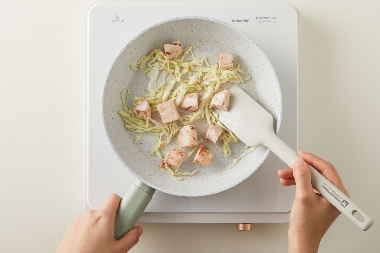 팬에 기름을 두르고 닭가슴살, 양배추를 넣어 골고루 익혀주세요.