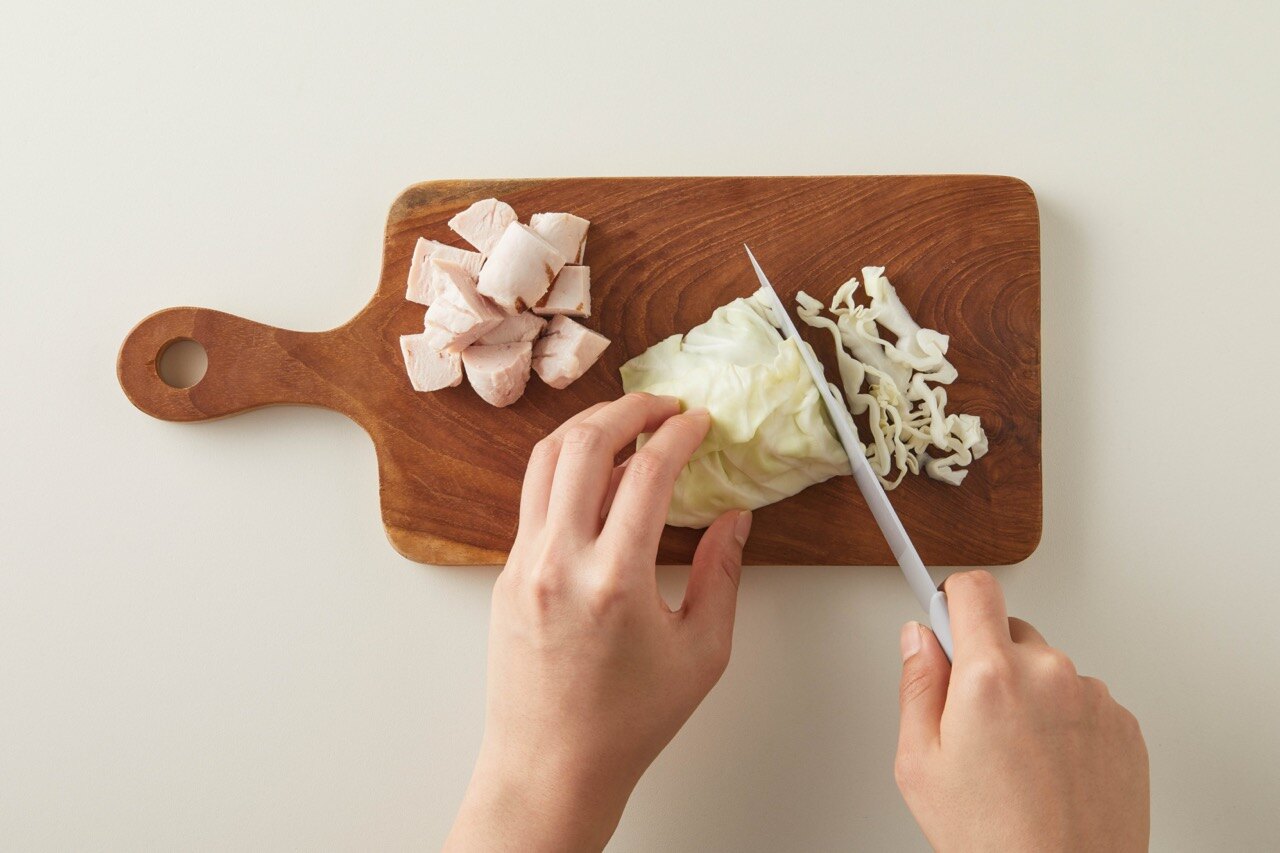양배추는 채썰고, 닭가슴살은 한입 크기로 잘라주세요.