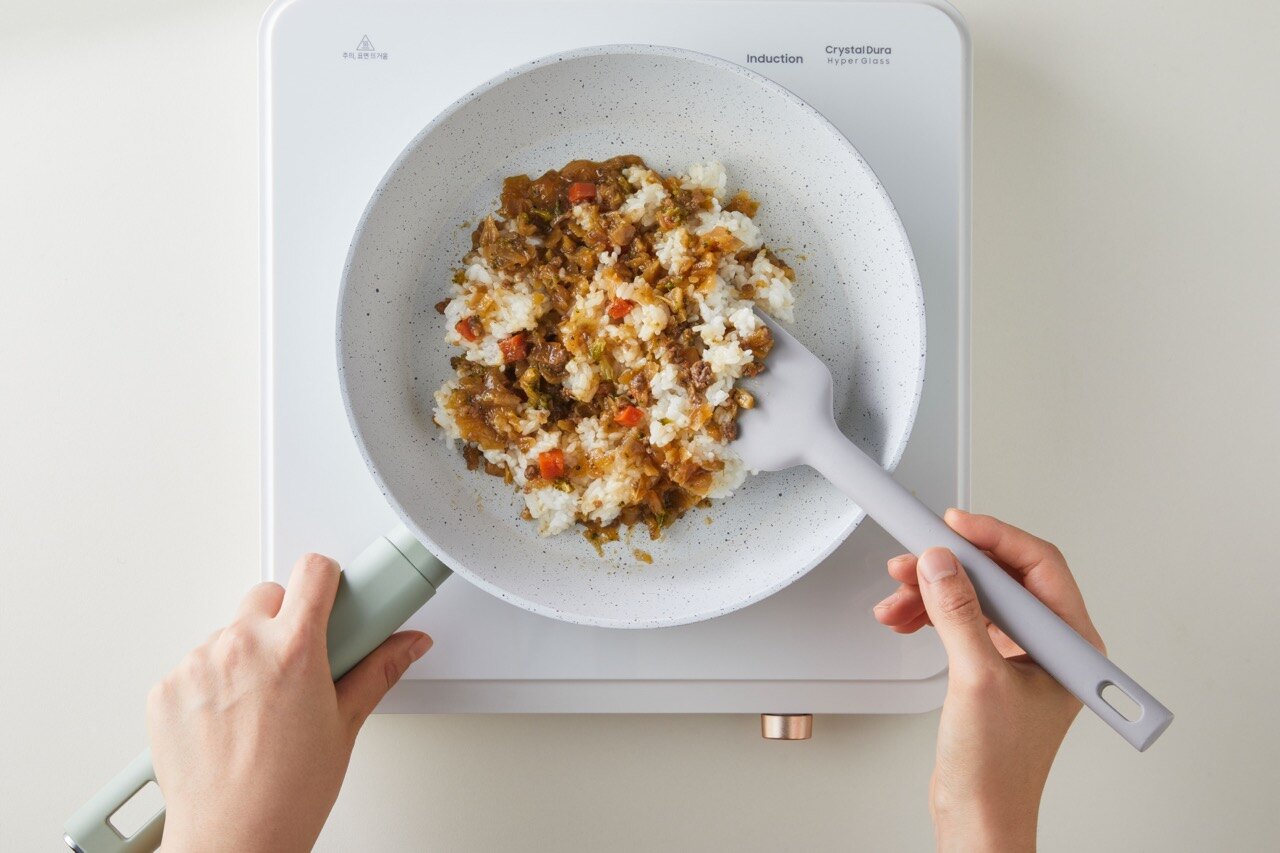 예열된 팬에 비프 토핑과 밥을 넣고 가볍게 볶아주세요.