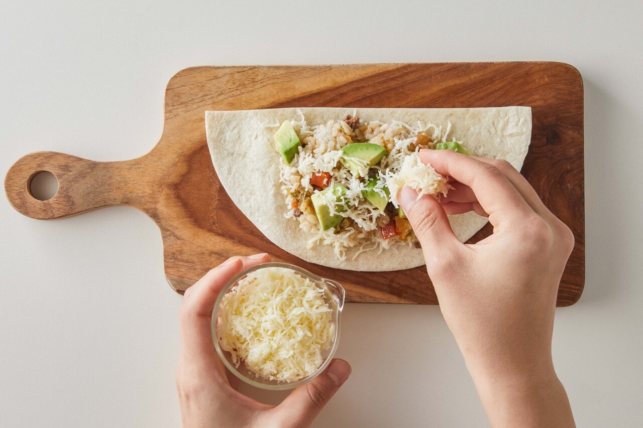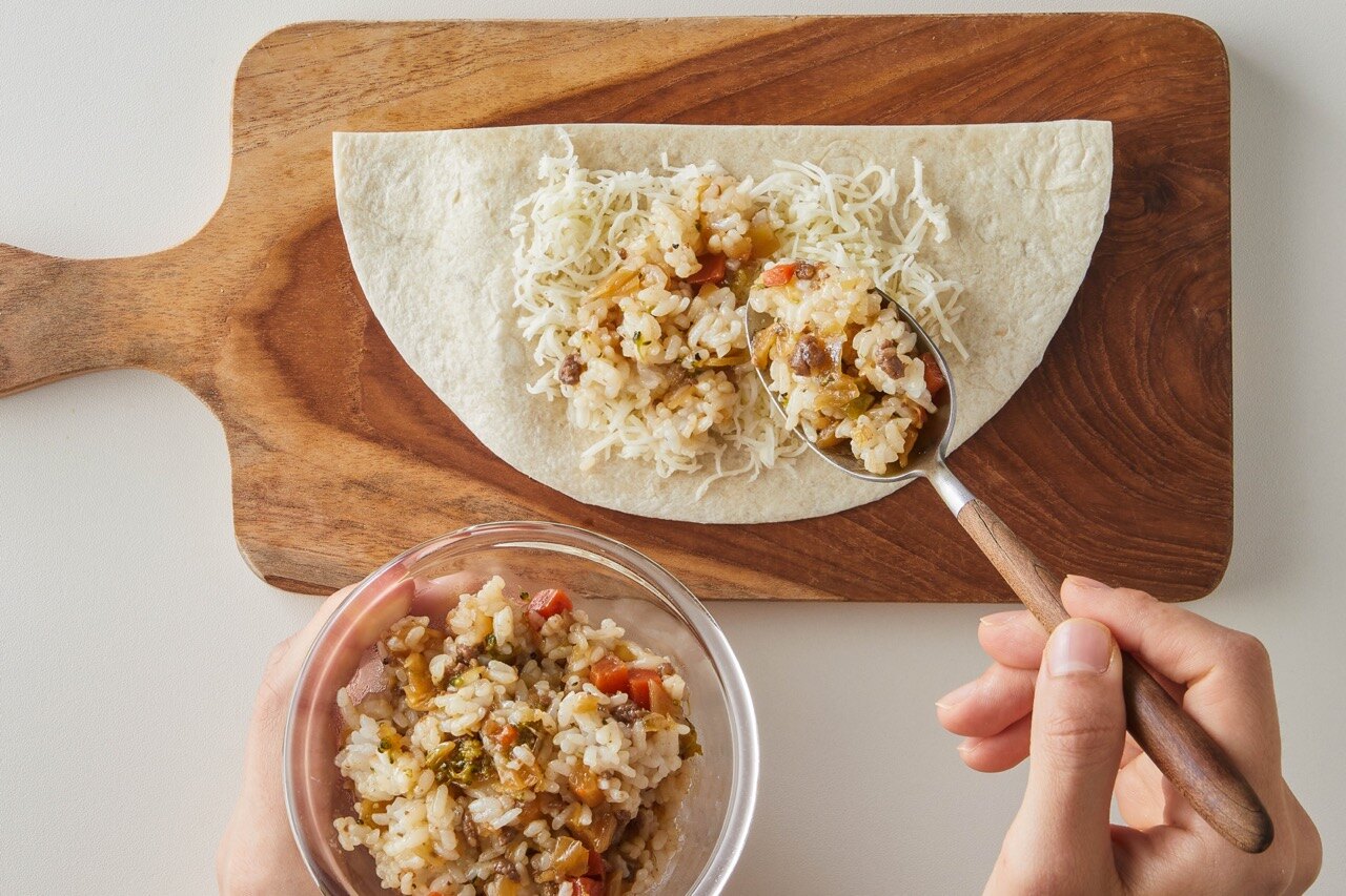 또르띠야 위에 치즈를 깔고, 볶음밥을 올려주세요.