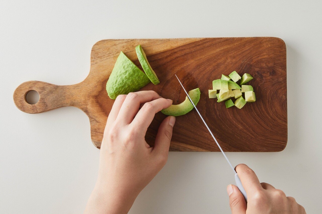아보카도는 1cm 크기의 큐브 모양으로 잘라주세요.