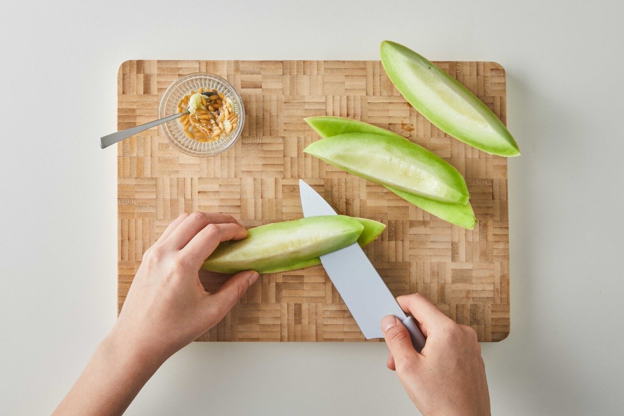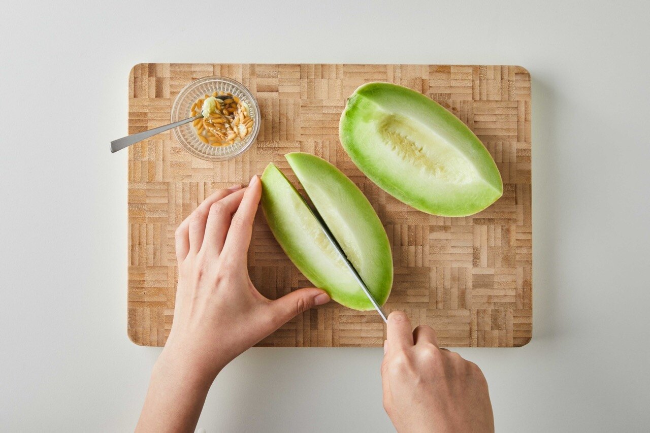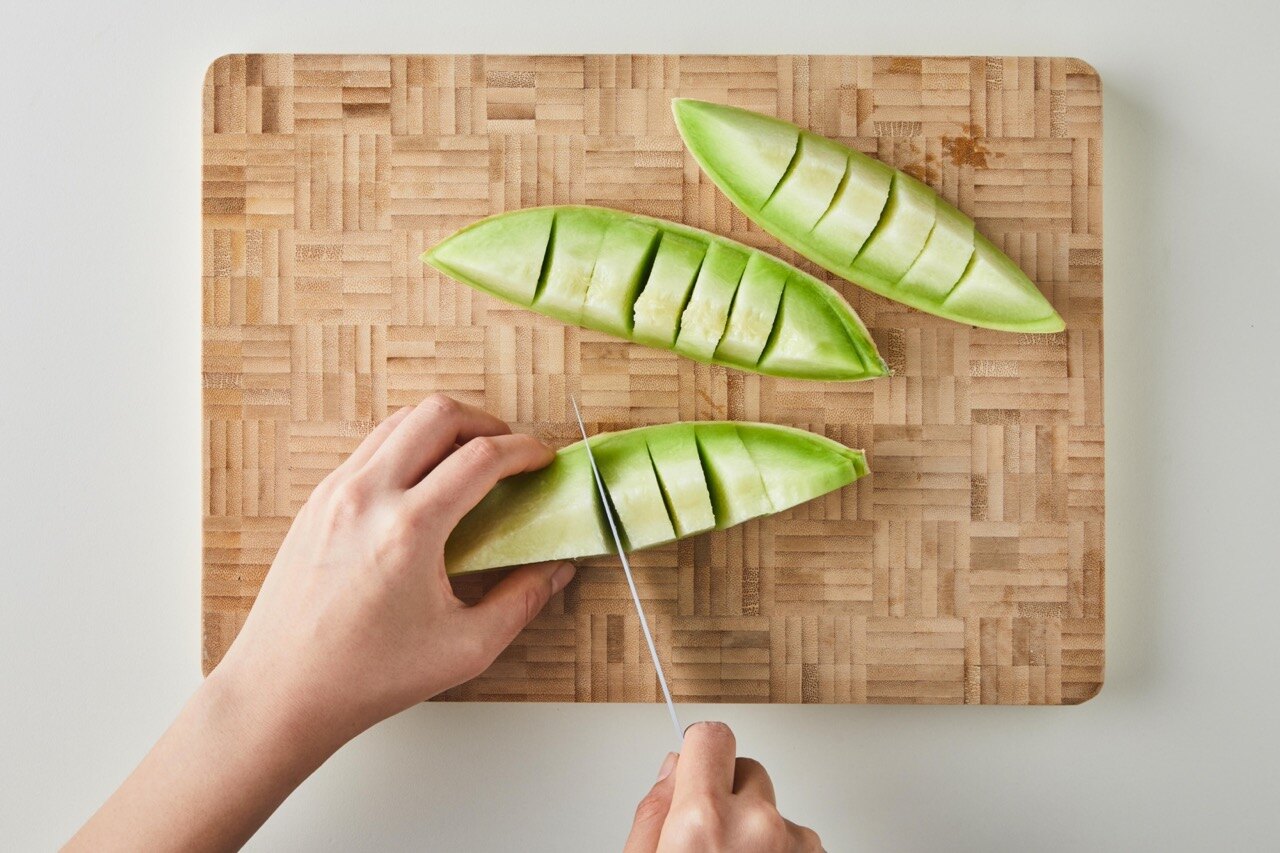 멜론은 씨를 제거한 다음 3~4등분으로 잘라주세요.