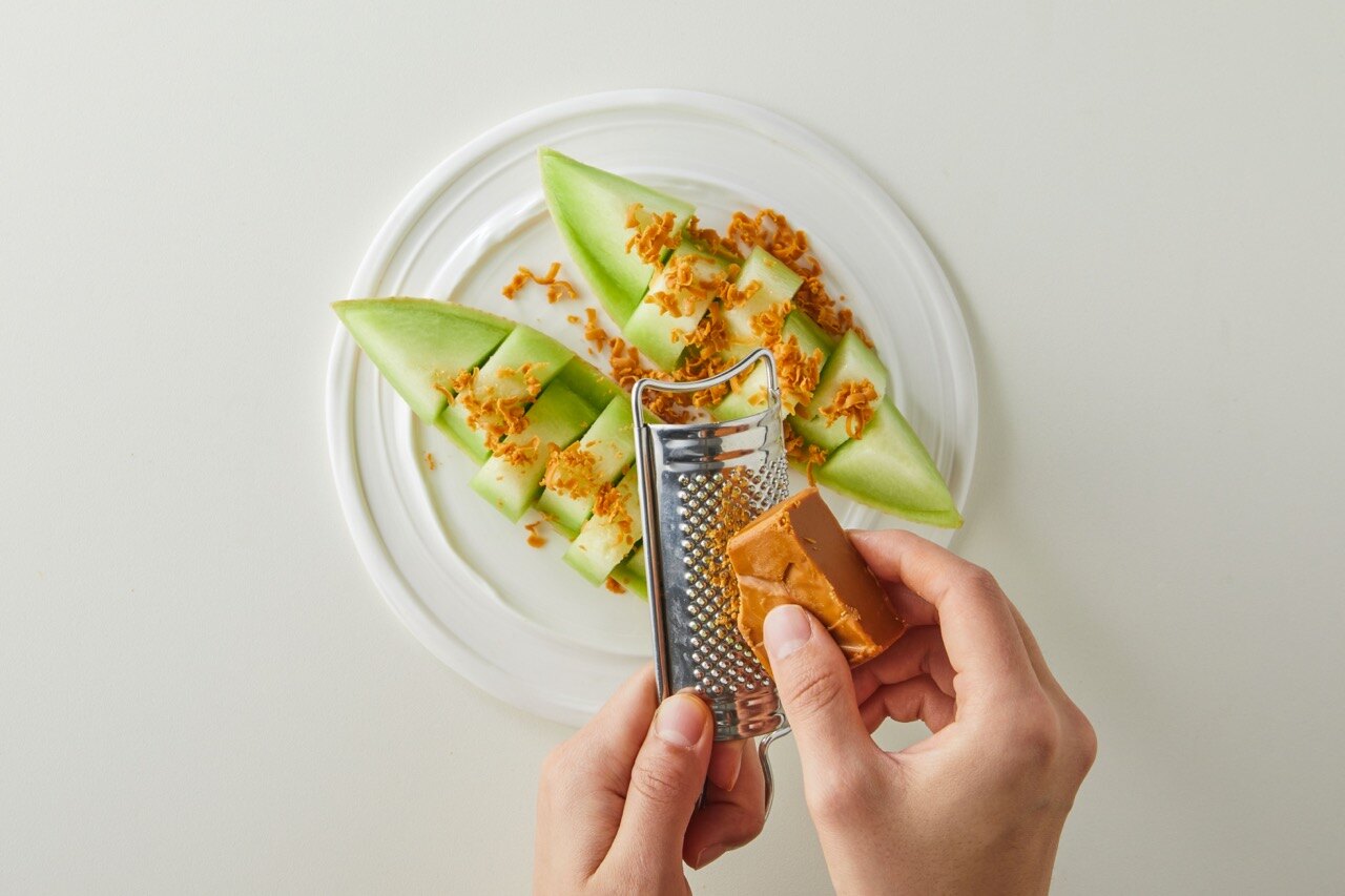 나머지 멜론 위에 브라운치즈를 얹어 완성해 주세요.