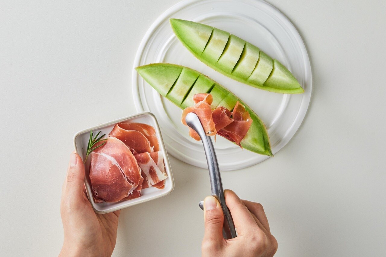 슬라이스한 하몽을 멜론 위에 얹어주세요.
