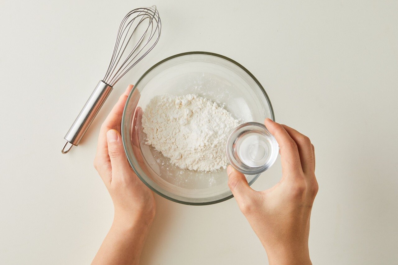 튀김가루와 물을 섞어 묽은 반죽을 만들어 주세요.