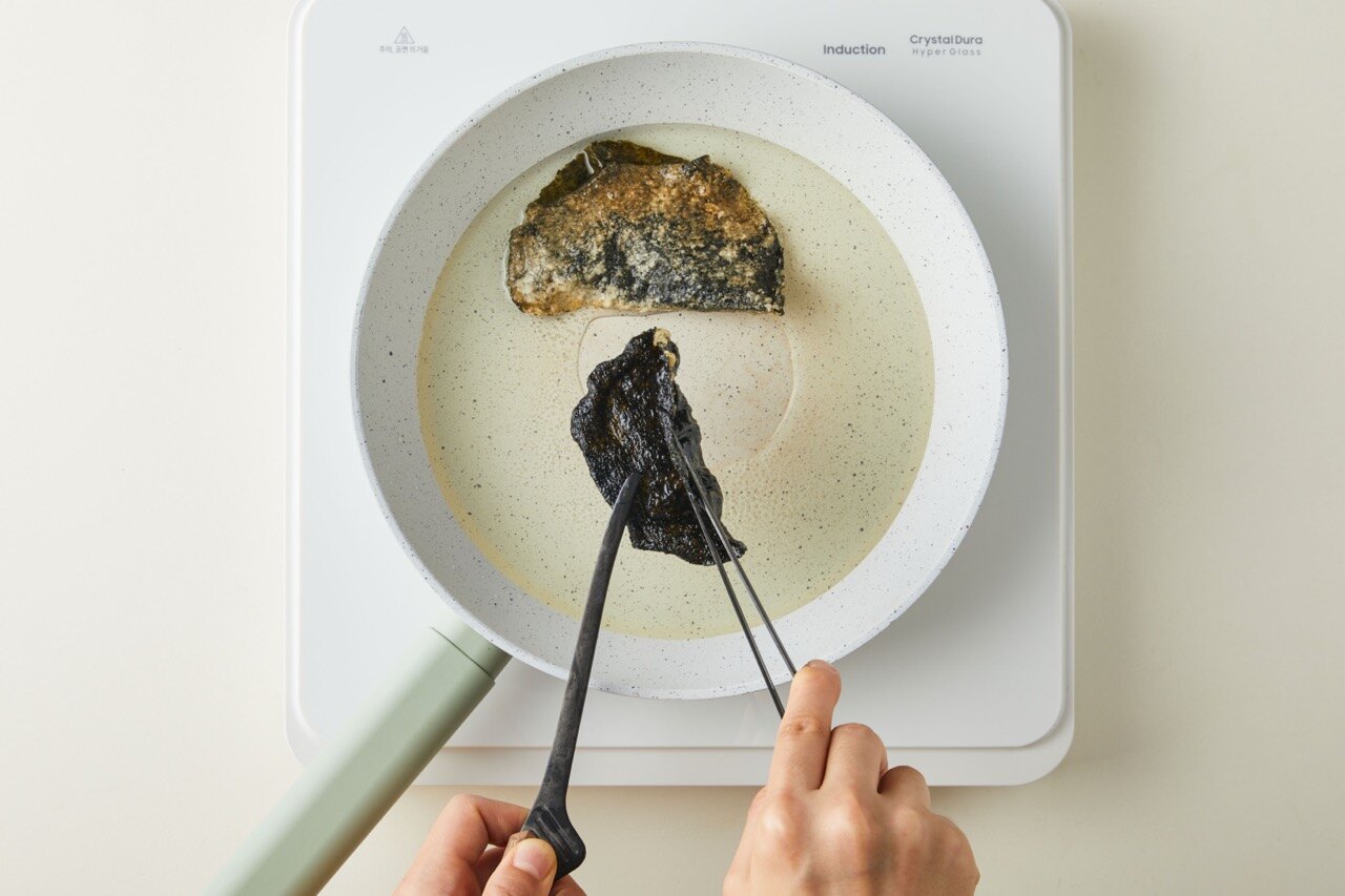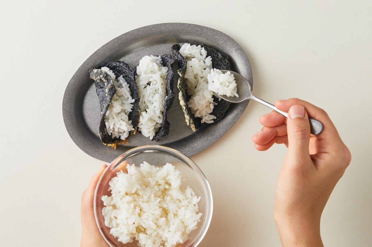 튀긴 김을 집게로 살짝 눌러 U자 모양의 ‘김밥 쉘’을 만들어요.