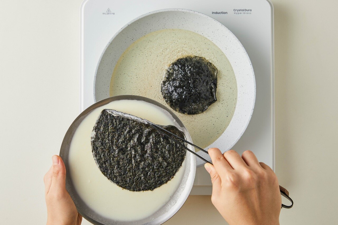 김 한쪽 면에 반죽을 묻혀 20~30초간 튀겨주세요.