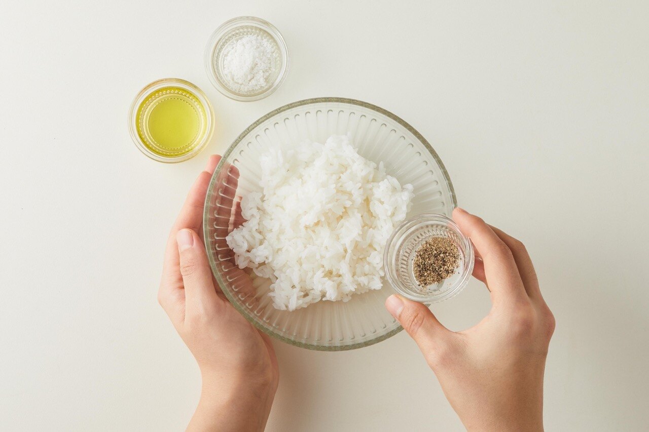 밥에 참기름, 소금, 후추를 넣고 간을 맞춰주세요.