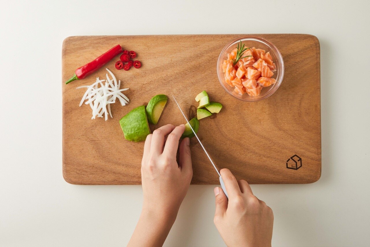 홍고추, 아보카도, 연어는 한입 크기로 썰고,