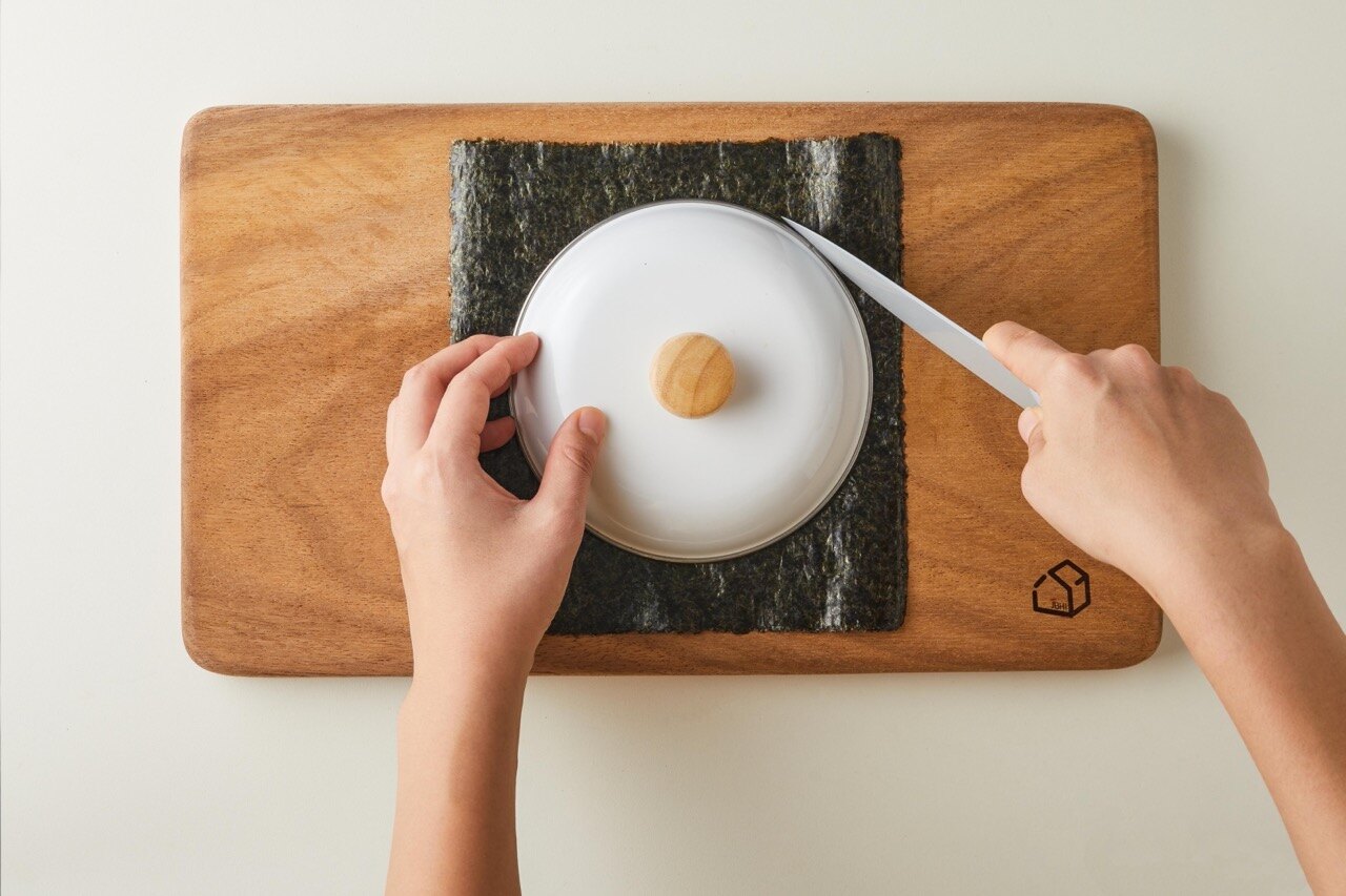 김 위에 냄비 뚜껑을 올려 동그랗게 잘라주세요.