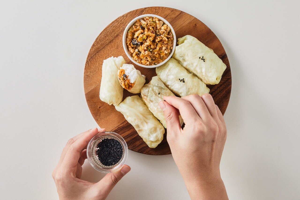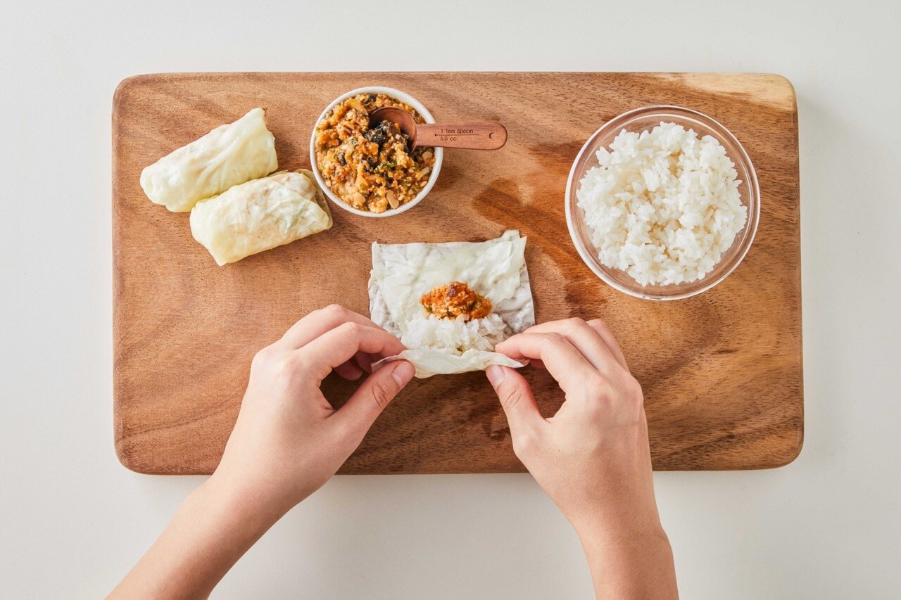 부드럽게 찐 양배추 위에 밥과 전복 우렁 강된장을 올려 돌돌 말아주세요.