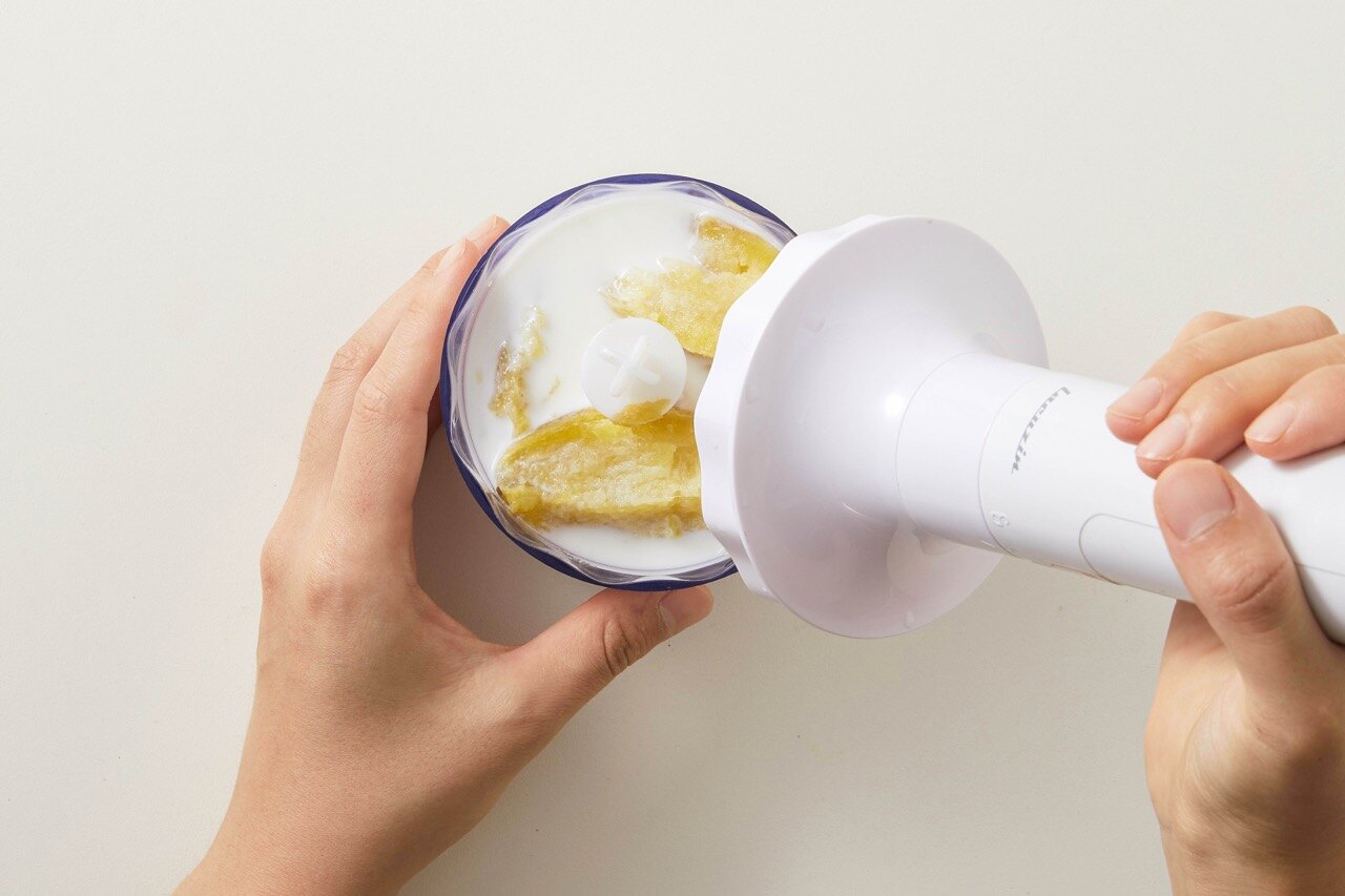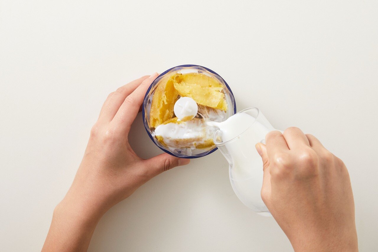 블렌더에 껍질을 벗긴 고구마 1개와 우유를 넣어 주세요.