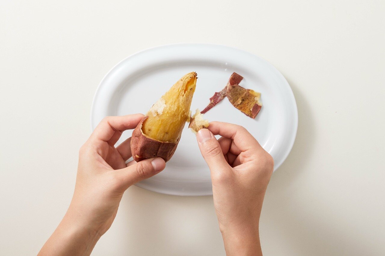 그리팅 아이스 군고구마를 전자레인지 3분 또는 자연해동한 뒤, 껍질을 벗겨 주세요.