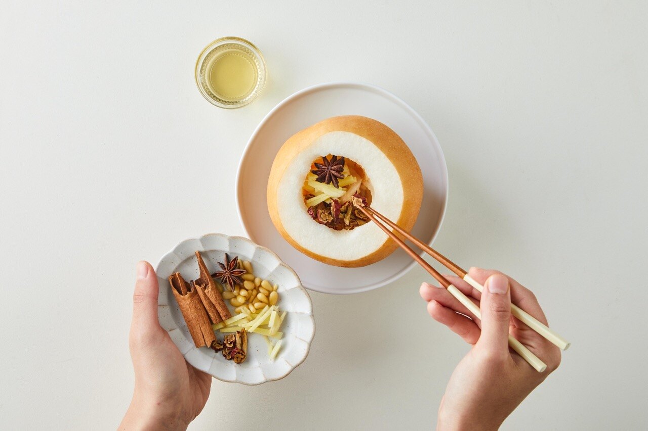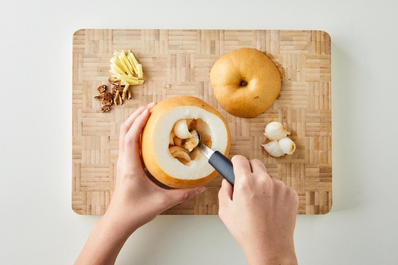 배 안에 파낸 과육과 생강, 대추, 잣, 계피, 팔각을 넣어 주세요.