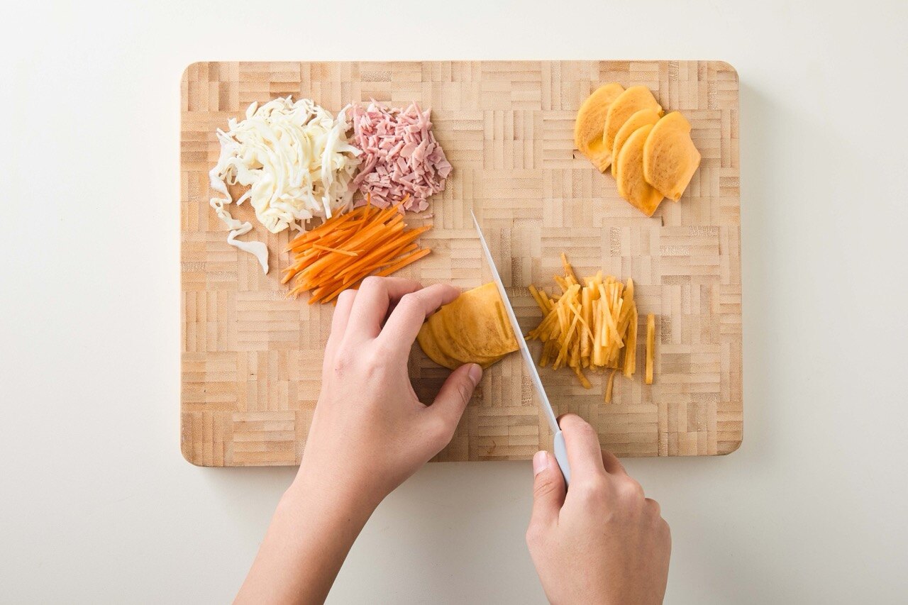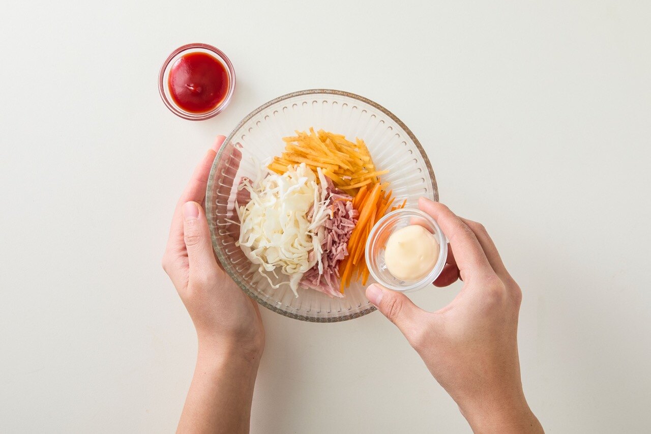 양배추와 당근은 채썰고 햄은 곱게 다져 주세요.