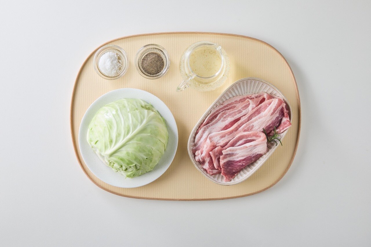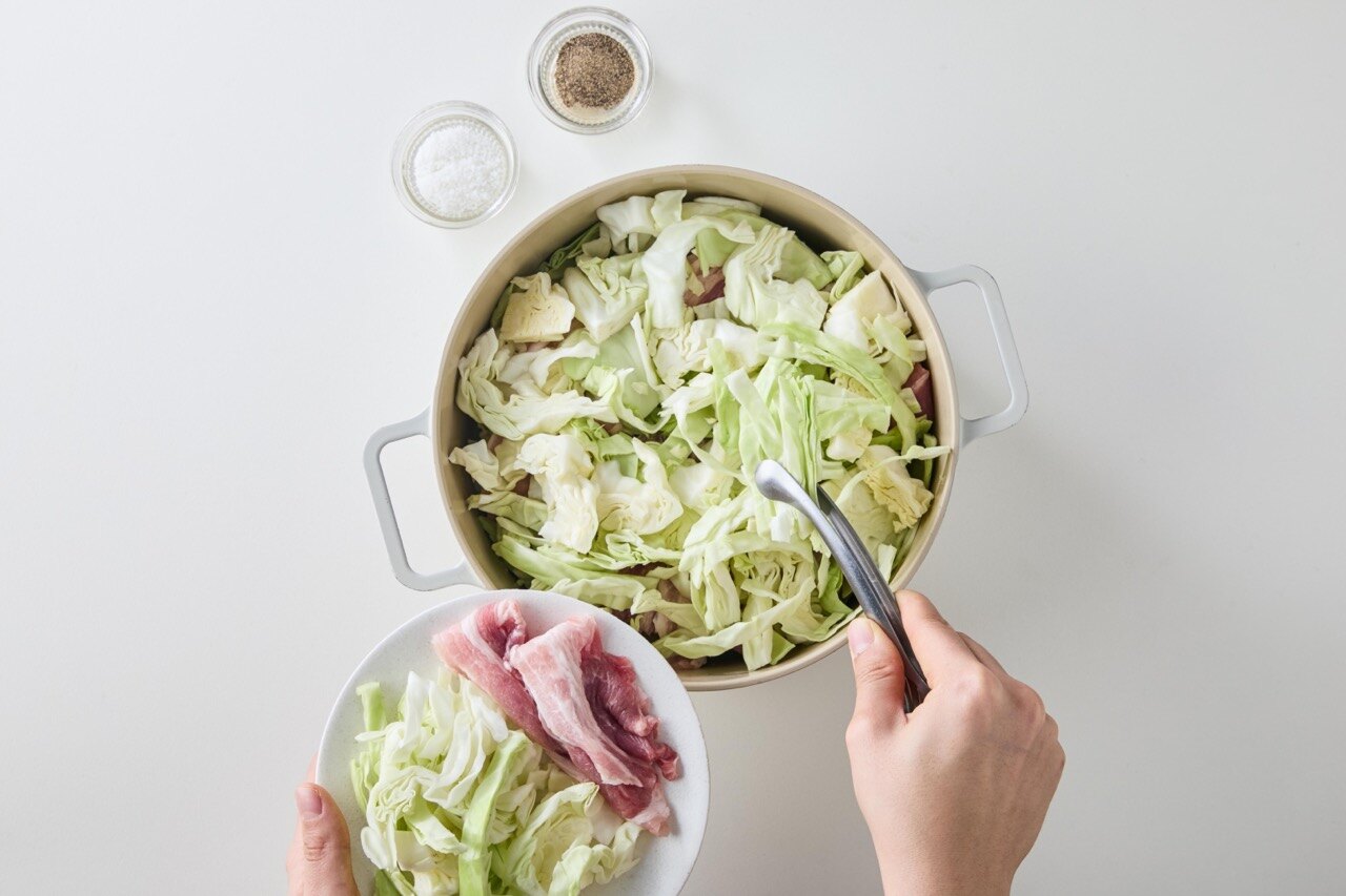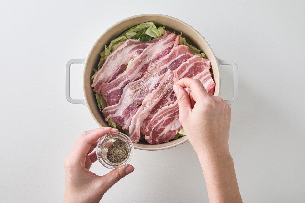 양배추 → 소금, 후추 → 삼겹살 순으로 반복해 층층이 쌓아주세요.
