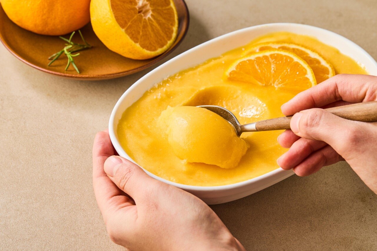 차갑게 얼린 뒤 곱게 갈아낸 소르베예요.