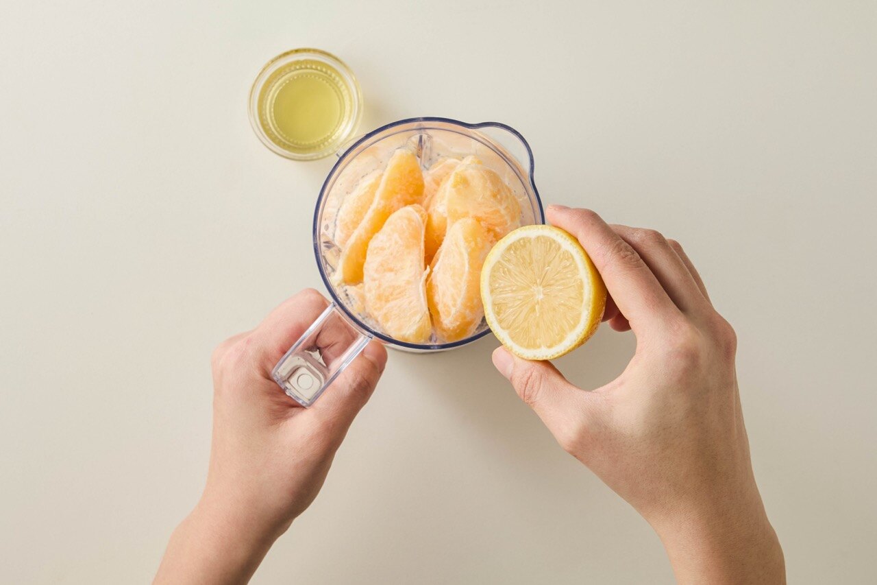 믹서기에 얼린 한라봉과 레몬즙, 알룰로스를 넣어주세요.