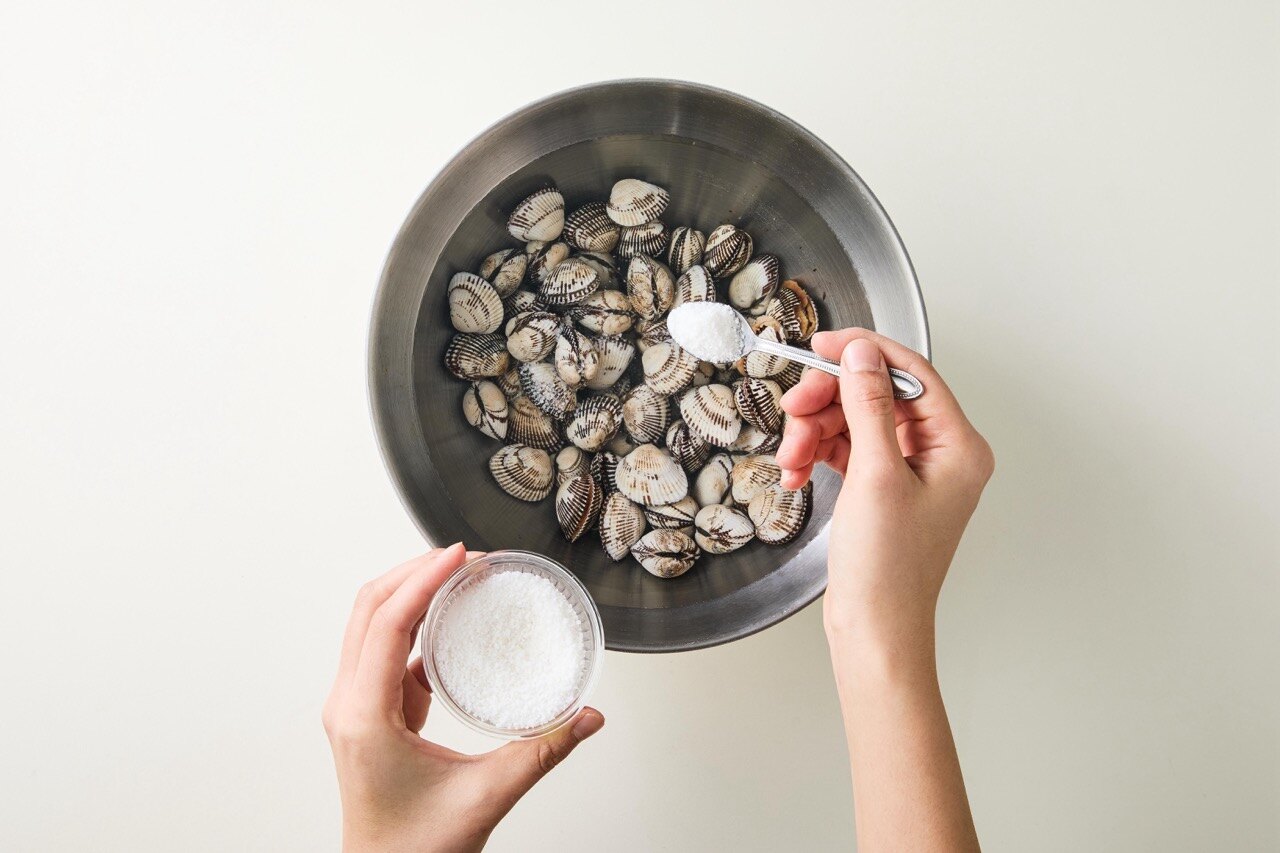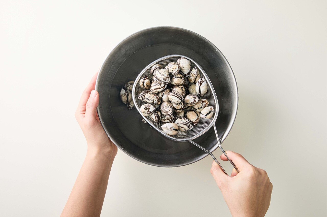 해감시킨 꼬막을 다시 한번 헹궈 주세요.