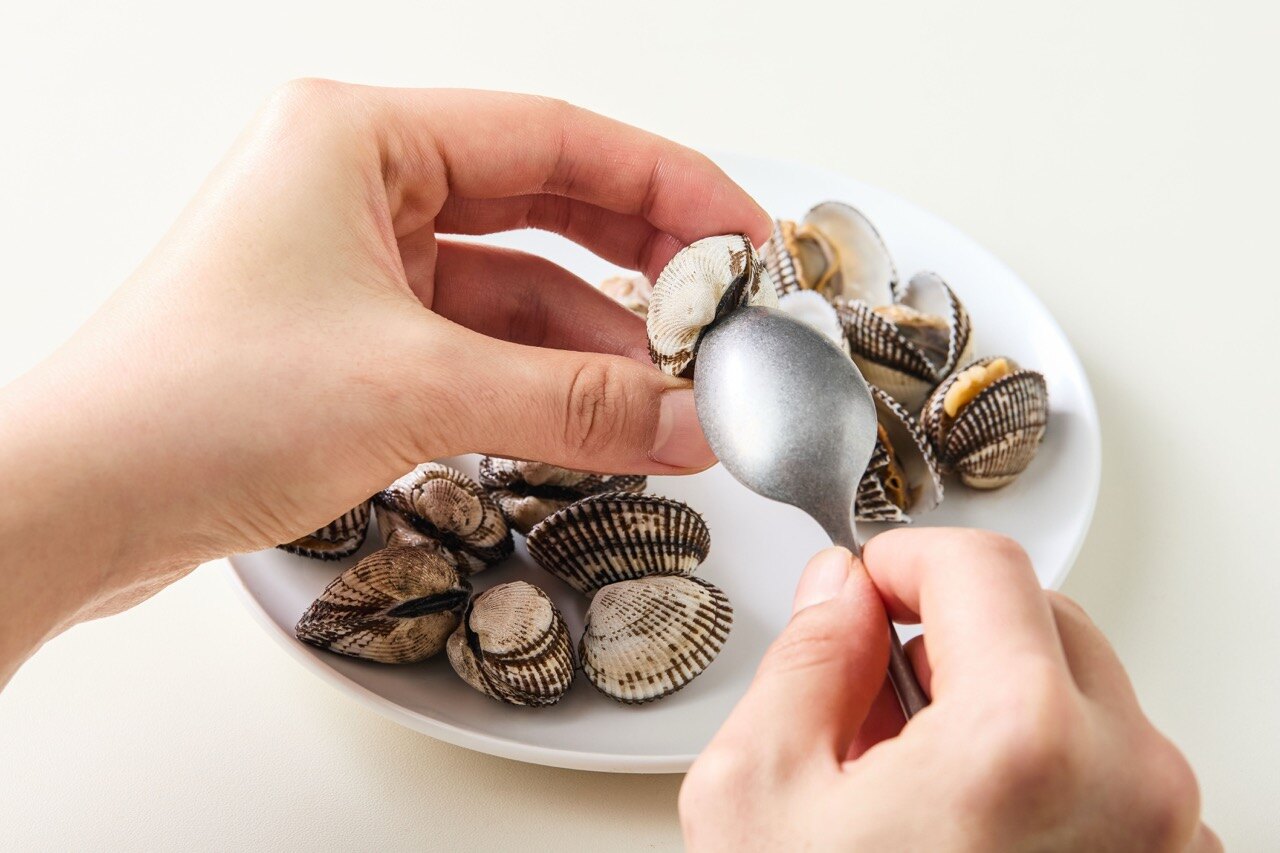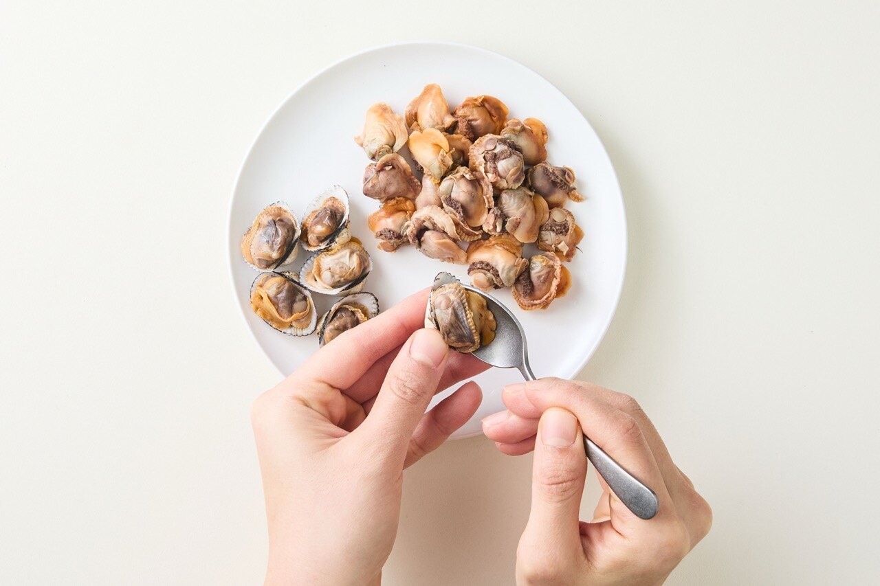 꼬막 뒷 편 흠에 숟가락을 넣고