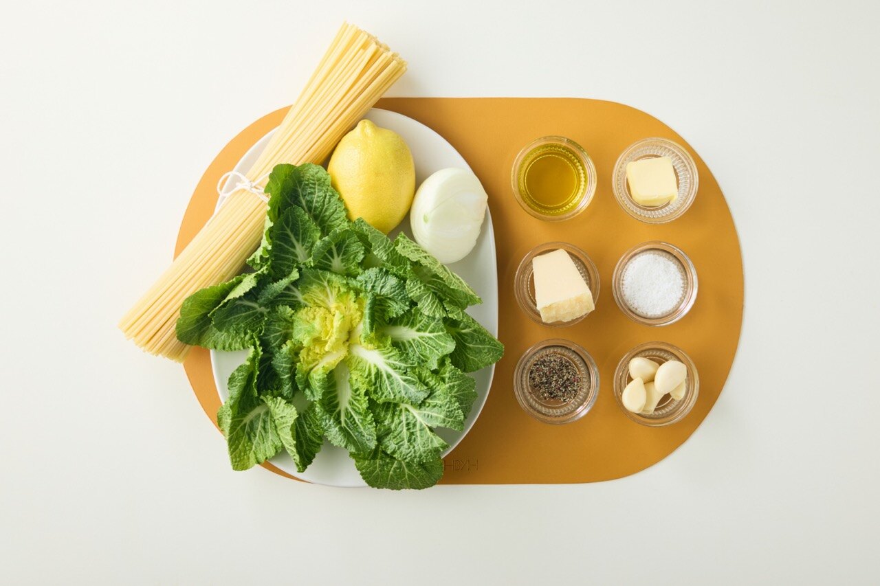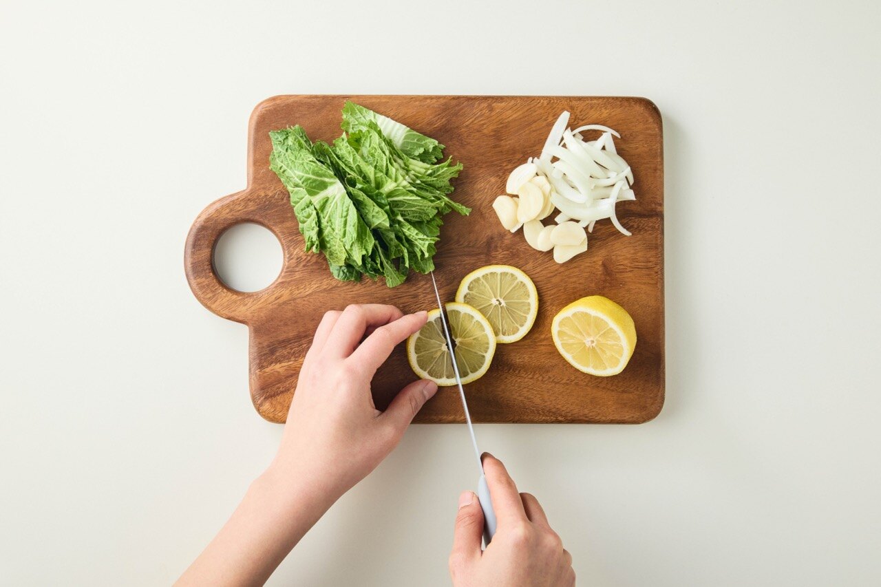봄동, 양파, 마늘, 레몬 1/2을 한입 크기로 썰어주세요.