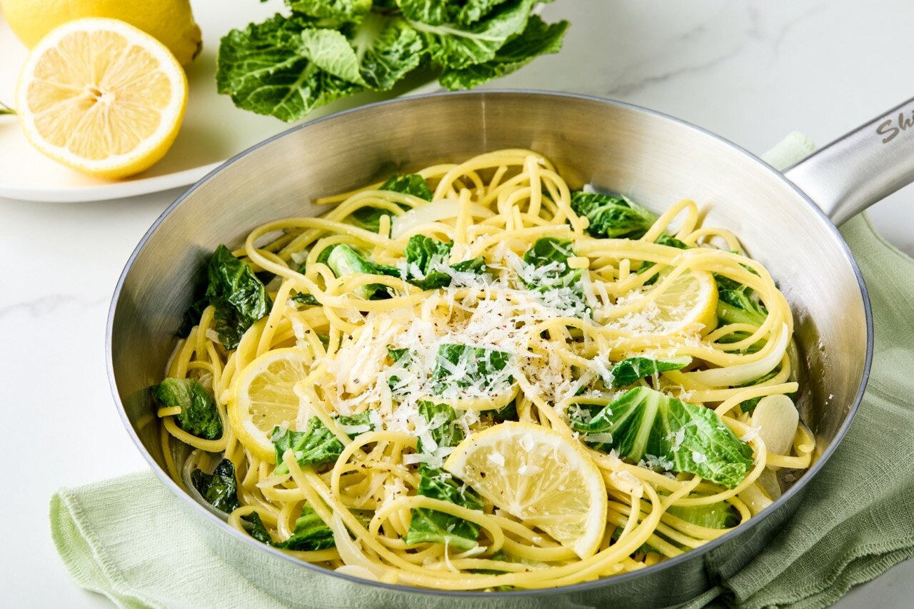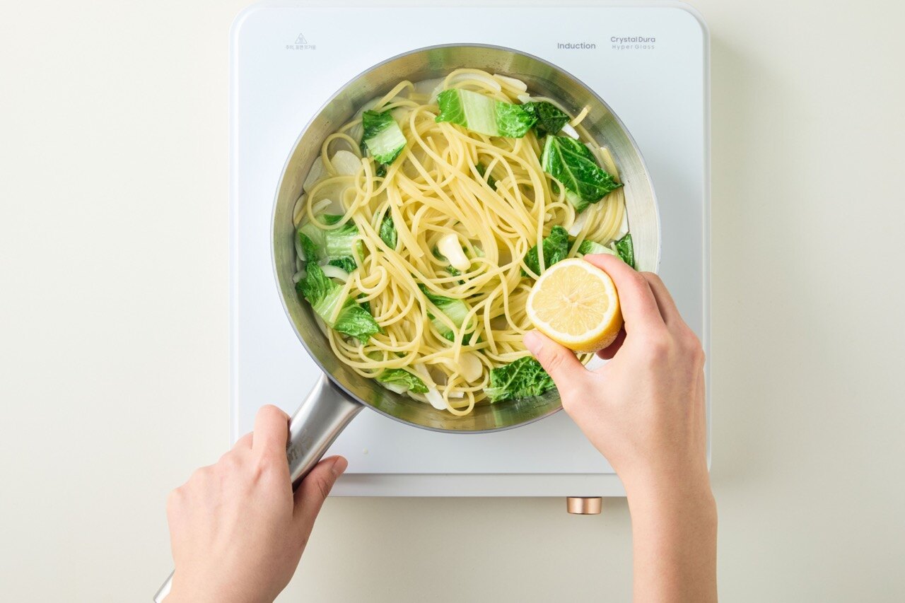 버터와 레몬즙을 넣어 재료들이 고루 코팅되도록 마무리해 주세요.