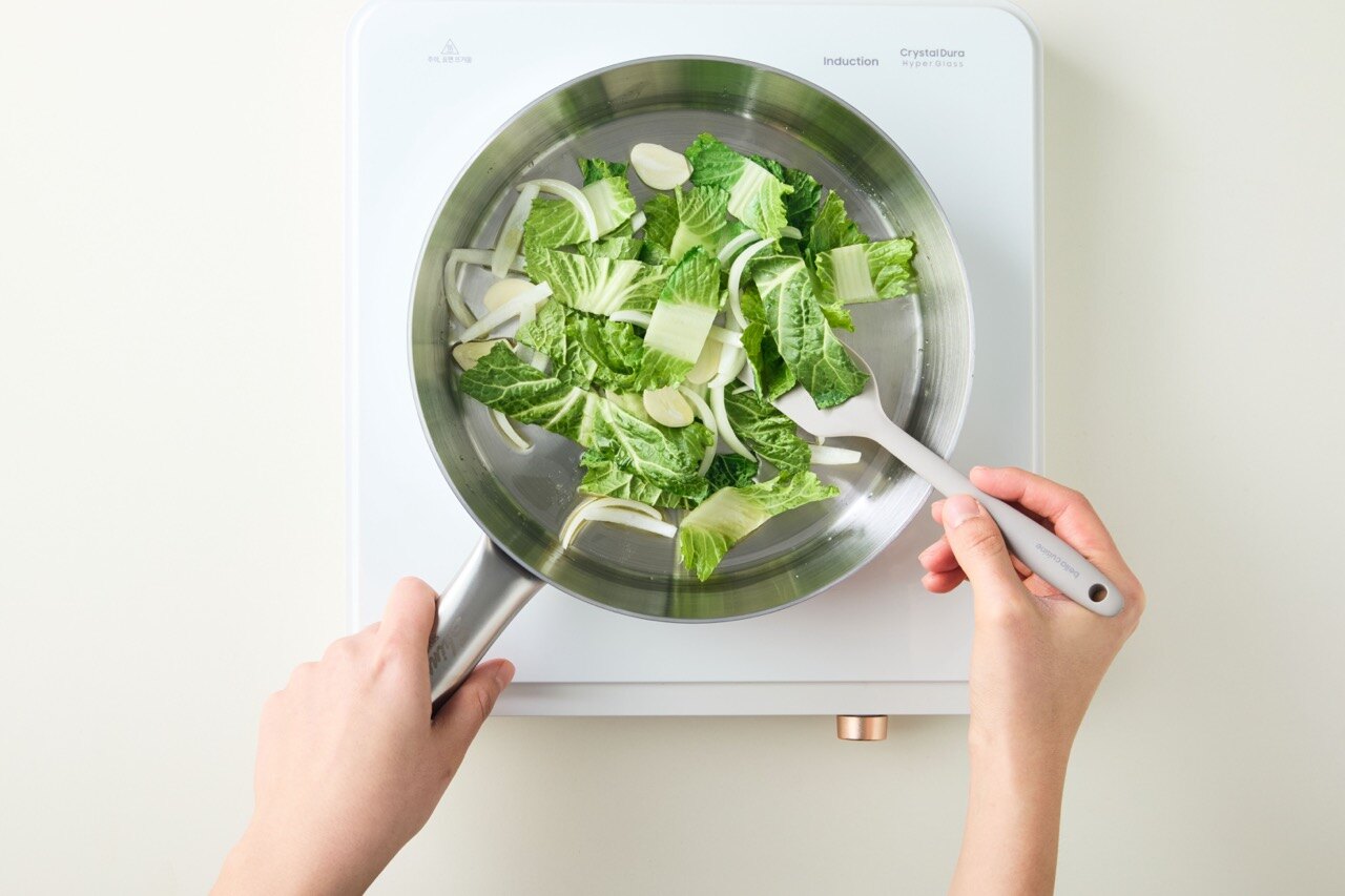 팬에 올리브오일을 두르고 봄동, 마늘, 양파를