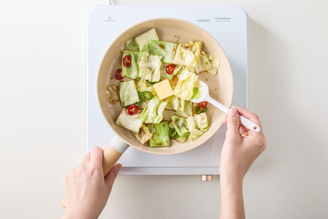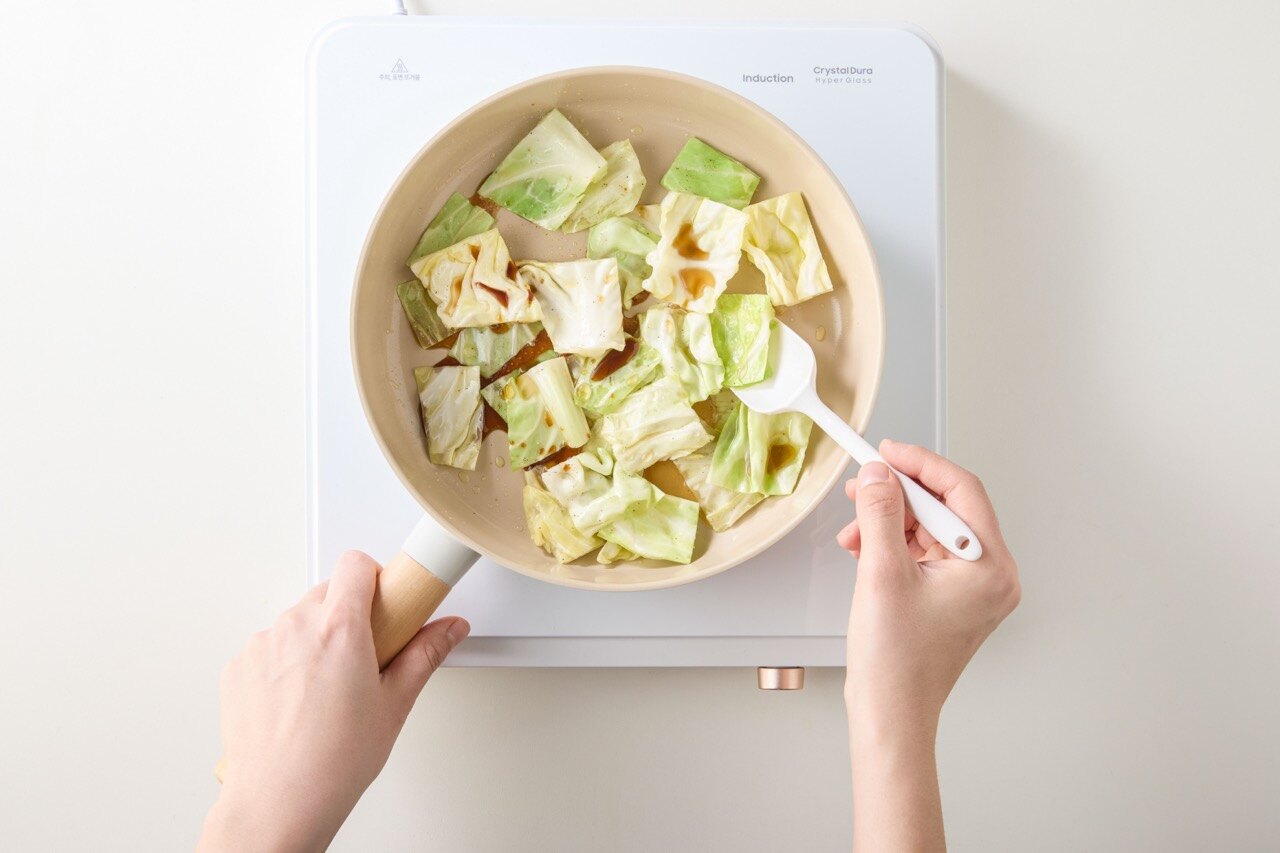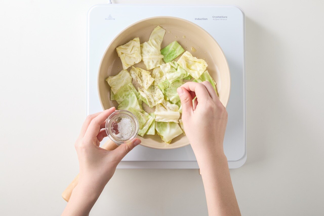 팬에 기름을 두른 뒤 중불에서 양배추를 넣고
