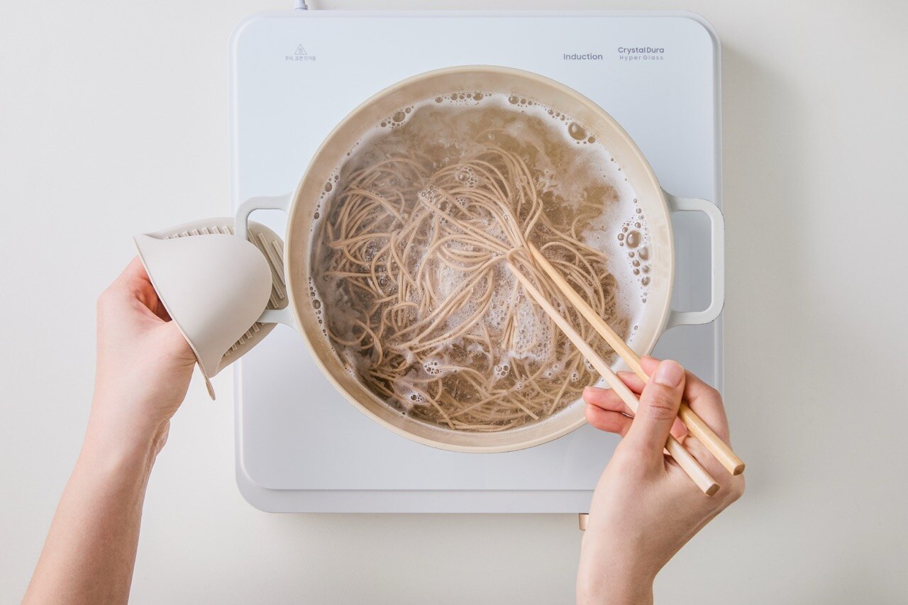 끓는 물에 메밀면을 넣고 약 5분간 삶아주세요.