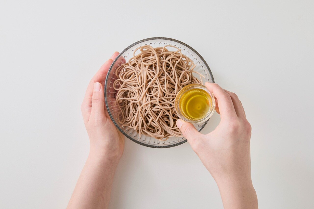 물기를 뺀 메밀면에 들기름을 넣고 가볍게 버무려주세요.